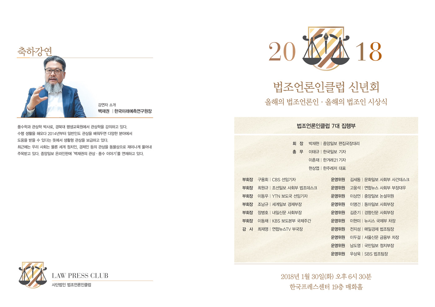 »ç´Ü¹ýÀÎ ¹ýÁ¶¾ð·ÐÀÎŬ·´(ȸÀå ¹ÚÀçÇö Áß¾ÓÀϺ¸ ÆíÁý±¹Àå ´ë¸®)Àº ¿À´Â 30ÀÏ ¿ÀÈÄ 6½Ã 30ºÐ ¼¿ï Áß±¸ ÇÁ·¹½º¼¾ÅÍ 19Ãþ ¸ÅÈȦ¿¡¼ ½Å³âȸ °â ¿ÃÇØÀÇ ¹ýÁ¶¾ð·ÐÀλ󡤹ýÁ¶Àλó ½Ã»ó½ÄÀ» °®´Â´Ù.